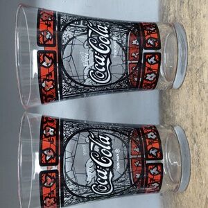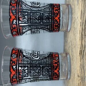 Pair of Coca-Cola glasses with striking red and black patterns. Ideal for enthusiasts.
