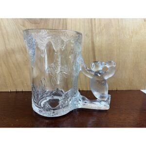 The product is a vintage Coca-Cola mug made of thick, frosted glass with a polar bear handle, manufactured in the United States in 1997. This rare piece of advertising memorabilia features the iconic Coca-Cola brand and is a unique collectible item for fans of soda theme merchandise. The clear glass and original design make it a desirable addition to any Coca-Cola collection.