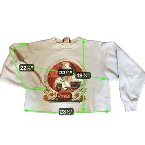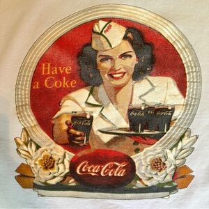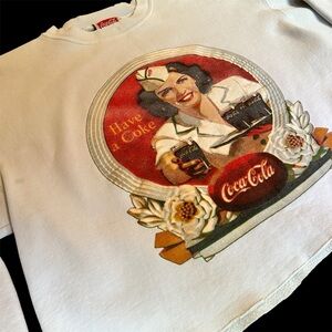 Authentic Coca-Cola brand sweatshirt featuring a classic vintage diner waitress graphic with “Have a Coke” retro script. Creamy off-white color with a relaxed drop shoulder and slightly cropped fit. Ribbed crew neckline and cuffs. Made from a cozy cotton-polyester fleece blend. Gently distressed collar adds charm.