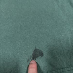 The collar is stretched out, and there is a stain area on the back. Graphic shows cracking consistent with vintage wear.