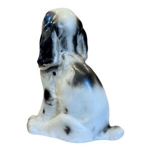 Add a touch of charm to your collection with this vintage black and cream porcelain dog figurine, featuring an adorable young Springer or Cocker Spaniel puppy in a seated pose. With its glossy finish and finely detailed expression, this sweet little figurine captures the lovable spirit of mans best friend.