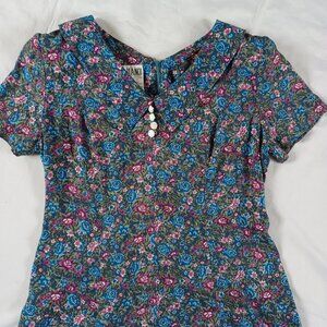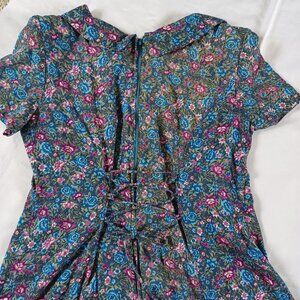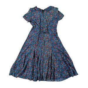 Flowy vintage Maxi Dress in good pre-owned condition. The panel on the right side of the back of the dress looks like it is from a different dye lot. If you look closely, you can see it in the photos. The panel runs all the way from the shoulder to the hem. No other flaws noted.