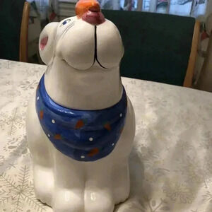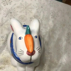 Vintage Coco Dowley rabbit bunny cookie jar. Dimensions are 11.75” tall with lid (6.75 without) and 8” long.