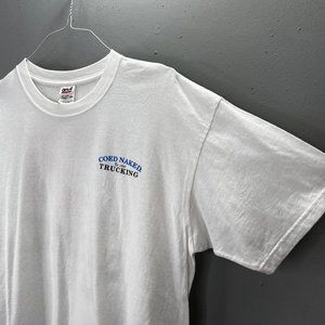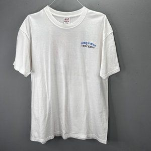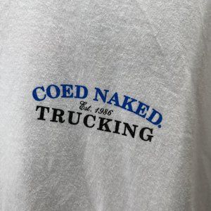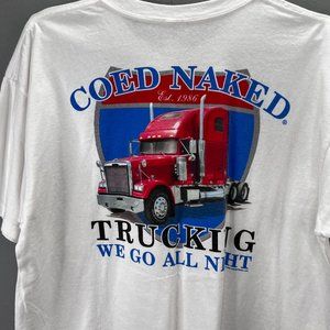 Vintage Coed Naked Trucking graphic trucker t-shirt in white. Crewneck, short sleeve, front and back design. Has very light discolorations on lower front (see last photo) otherwise nice and bright. Good condition. Size XL.