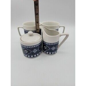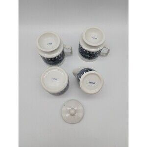 Vintage Coffee or Tea Set Navy Paisley 2 Cups, Cream & Sugar Porcelain - This little coffee set is in exceptional condition. No chips, cracks, or repairs. There is a spot on the sugar that looks like a chip, but it is a place where the glaze was missed. See the photos. Item is sold as is. Measurements are inside the photos. Please ask all questions prior to purchase.