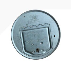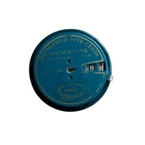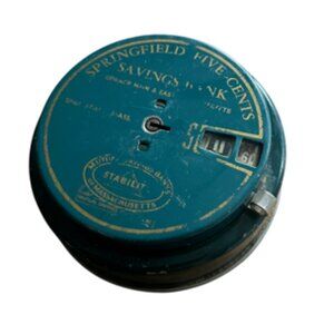 Vintage Springfield Five Cents Savings Bank with key. Marked on back: Bank registers nickels, dimes, and quarters. Steel Products Corp. of California. San Francisco U.S.A.