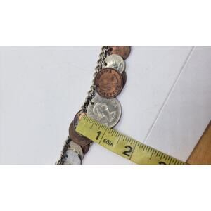 All coins are drilled and securely attached to the metal link bracelet, creating a collectible and interesting statement piece. Coins range in size and origin, giving a global, eclectic feel. The bracelet measures approximately 7 inches in length as shown in photos. Largest coin is about 1.25 inches in diameter. Decorative and a conversation starter, perfect for collectors of vintage coin jewelry or unique charm bracelets.