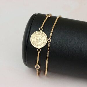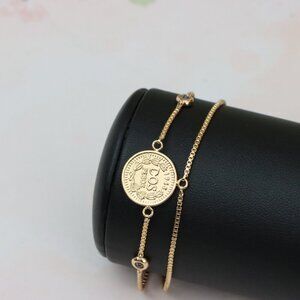 Elegant rose gold bracelet featuring a vintage-style coin charm and dual-chain layout for a timeless appeal.