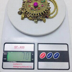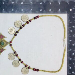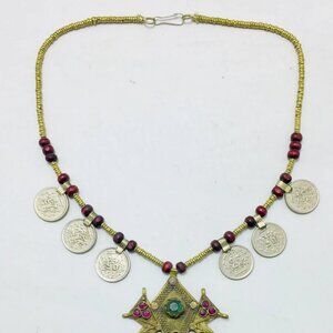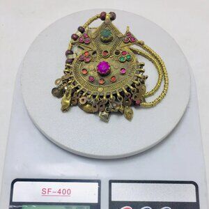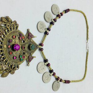 • This marvelous long chain Turkmen pendant necklace has a unique, distinctive Pendant that sets you apart – Feature Pendant is a stunning center inlaid by lots of colorful glass stones. This impressive tribal women’s Pendant was made to be seen and admired.