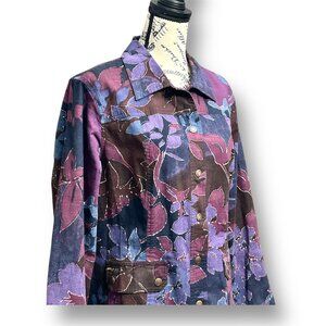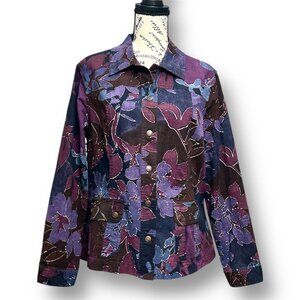 Vintage Coldwater Creek floral jacket in bold purple and blue hues. Features snap front closure, utility pockets, and artsy boho flair, a perfect lightweight statement layer.