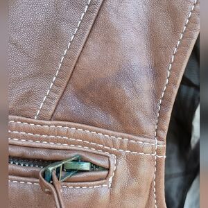 Has a darker spot in one area (shown in pictures) but such an amazing leather vest. Classic.