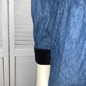 100 percent cotton velvet trim button down denim long sleeve dress with pockets. Velvet trim collar and button cuffs. Velvet buttons. Excellent vintage condition. Size medium.