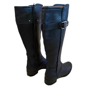Vintage heritage Cole Haan premium Italian-made era (’90s Venetian Tanneries), renowned for craftsmanship surpassing later production. Equestrian-style boots, tall silhouette hitting just below the knee, black pebble-grain leather, buttery brown leather lining, genuine leather soles reinforced with Vibram traction. Full top-to-bottom zipper, decorative buckle accent. #QuietLuxury #OldMoneyStyle #EquestrianChic #HeritageLeather #TimelessClassic