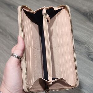 Vintage Cole Haan Peachy Cream Zip Around Wallet, lots of room for storage and cards. Please see pics for use and light stain in leather on back. Zipper works great and lots of life left. Soft and supple.