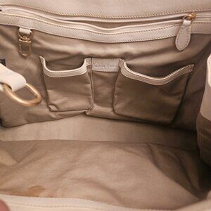 Really beautiful white with gold hardware should bag. Had clip to secure sides, lots of pockets, slight stain on the inside, wear appropriate with age. Leather and satin material, no visible stains on the outside on either side of the purse. Comes with dust bag. Definitely make a statement. Please review all images prior to purchase, all sales are final.