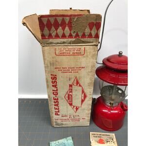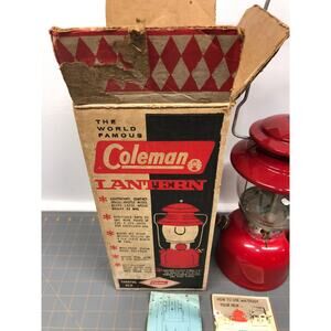 Get your hands on this classic Coleman 200A red lantern! This vintage lantern features a single mantle design and comes with its original box. Perfect for collectors, camping enthusiasts, or anyone who appreciates a piece of American history.