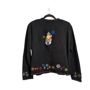 Keywords: Cardigan sweater, button-front knit, black, ebony, jet, multicolored, vibrant hues, snowman appliqué, embroidered snowflakes, beaded details, holiday motif, festive pattern, winter scene, novelty design, acrylic blend, knit fabric, soft texture, comfortable, relaxed fit, casual, cozy, seasonal, holiday party, Christmas celebration, winter gathering, ugly sweater party, cold weather, winter fashion, whimsical, cheerful, retro, vintage inspired