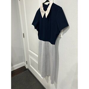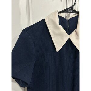 nautical, collared dress, navy dress, striped dress, professional wear, short sleeve dress, zipper closure dress, elegant dress, formal dress, office dress, cotton blend dress, textured top, fashion, chic style, kidcore, Wednesday, schoolgirl