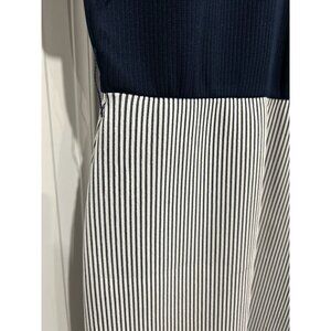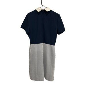This dress features a sophisticated design with a navy textured top and a contrasting striped skirt. The collar adds a touch of elegance, making it suitable for formal settings or professional environments. The mini length offers a contemporary style, ideal for various occasions, while ensuring comfort with its fabric blend.