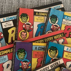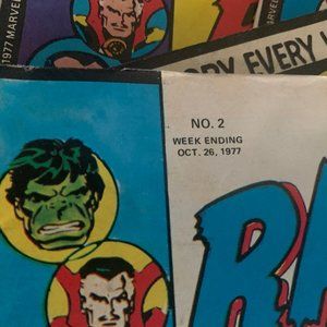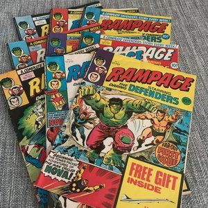 This set of Rampage comics is imported from England. The 1977 series are books # 1, 2, 3, 4, 5, 6, 7, 8 & 9. Please note that there are no inserts included. This series is in good condition with a noted tear on the back of book #3. No other flaws appear on any other book. These are original printings from 1977 with one owner. These comic books will only be sold together. Great for any collector!