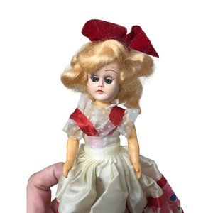Vintage Collectible Doll With Blonde Hair wearing floral printed dress/red bow- Arms and Head Move. Eyes open and close.