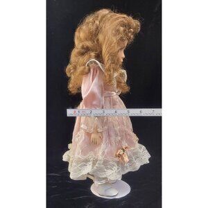 Vintage Collectible Porcelain Doll with Pink Satin and Lace Dress. Crafted in the 1980s, this beautiful doll features a porcelain head, arms, and feet with a cloth body. Her dress is a beautifully made pink satin with a white lace overlay, adorned with pink bows and white roses. Approximate height is 16 inches. Stand is included. Please see the provided photos for further details.