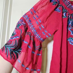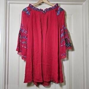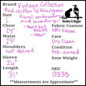 Vintage Collection Women's Red Chiffon Top Tunic Blue Floral Embroidery Beaded L