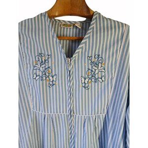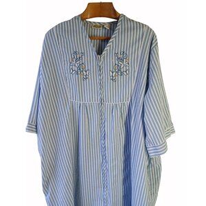 This lightweight caftan dress offers a relaxed fit with a stylish button-down front, striped pattern, and delicate embroidery. Its cotton-polyester blend ensures comfort and durability.