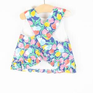 This is a sweet, sleeveless top by Collections for Children in blue with a multicolor tulip print. Features a ruffle hem and a cross back design. A beautiful top for summer.
