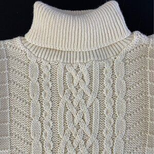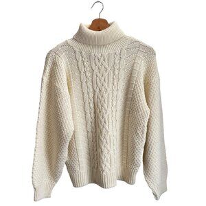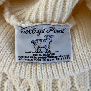 This vintage College Point sweater features a timeless cable knit design in a cozy cream hue, complete with a thick ribbed turtleneck and intricate textured stitching throughout. Made in the USA of 100% acrylic, it offers both warmth and durability in a relaxed, classic fit. Perfect for cold-weather layering and effortlessly styled with jeans or trousers, this sweater exudes a quiet elegance that fits both old money and cottagecore aesthetics.