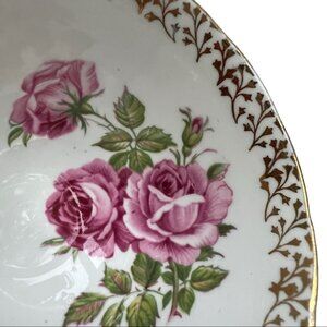 This elegant vintage teacup and saucer set by Collingwood dates back to the 1950s and showcases the timeless charm of mid-century English bone china. The set features a delicate floral pattern with mauve pink roses, soft green leaves, and gold gilt accents that highlight the rim, handle, and base.