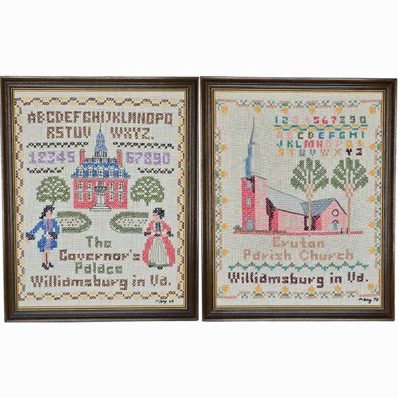 Vintage Colonial Williamsburg Framed Cross Stitch Set of 2