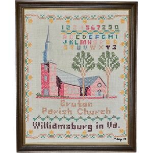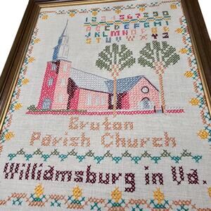 Framed cross stitch of Colonial Williamsburg Governor's Palace and Bruton Parish Church on linen type backing.