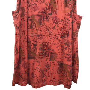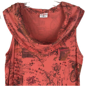 Vintage CMC Color Me Cotton Dress Sleeveless Drape Neck Botanical Bicycle Floral Village Script Coral Orange Size Medium