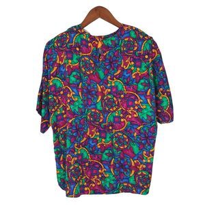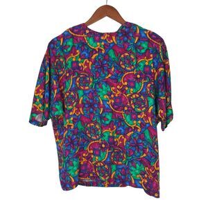 Vintage Colorful Abstract Floral Print Short Sleeve Blouse Stain Glass Sz Medium
