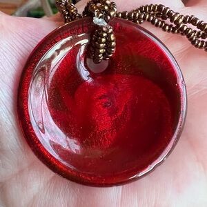 Unique pendant with a glass swirl of red, green, and gold. Features a micro beaded chain.