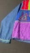 Vibrant denim jacket with colorful patchwork design. Features red, purple, yellow, and blue sections with unique stitching.