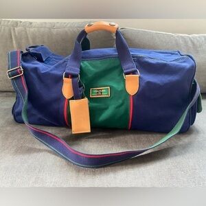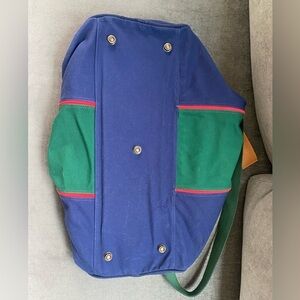 Vintage Colours by Alexander Julian large duffel, travel/overnight bag in excellent preowned condition. The bag is made of blue and green canvas with the red piping and tan leather trim. It was probably only used once because the interior and exterior are clean. There is a large flap pocket and zipper pocket on each side of the bag. It has a double zipper closure on the top. There are two handles and and adjustable shoulder strap and a luggage tag.