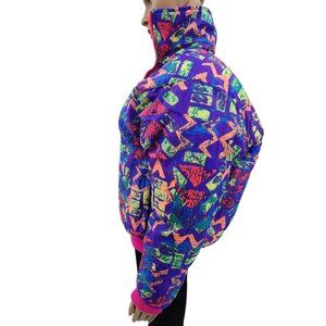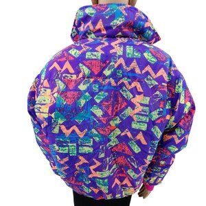Step back to the vibrant 80s with this reversible Columbia jacket. One side boasts a bold neon print, while the other is a vivid solid pink. Insulated with cozy down, it’s perfect for chilly days. This versatile piece offers both style and warmth, making it a retro wardrobe essential.