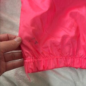 Eye-catching pink pants with a vibrant blue accent inside the pocket.
