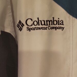 Vintage Columbia ski jacket. Jacket is white, teal green and black. Features a hood that can fold away and multiple pockets. Perfect for outdoor activities. Great vintage condition!
