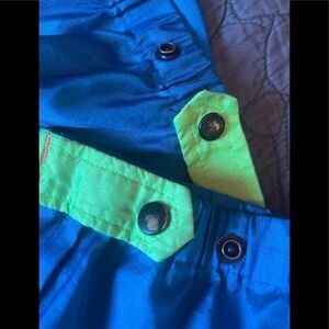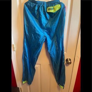 Vintage Columbia blue wind pants with neon green and pink. Zippered bottoms plus snap closures. Great Condition. The only thing is the snaps on bottom of pants are worn, a couple smal snags in the back. But not that noticeable