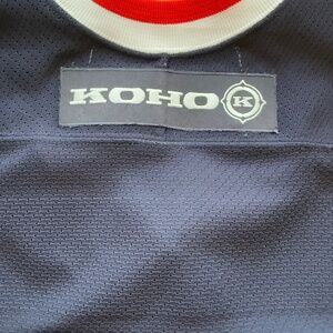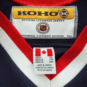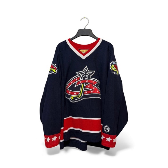Description: This vintage Koho hockey jersey features a bold navy body with a large Columbus Blue Jackets original (2000-2007) logo across the chest, detailed with stars and contrasting red, white, and yellow accents. It has a V-neck with red and white trim, team patches on both shoulders, and a striking red hem and cuffs decorated with white stars. Made from breathable, textured fabric with a roomy fit, it’s perfect for game day wear or adding to a fan collection.