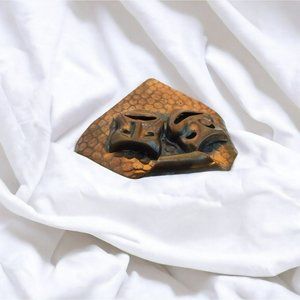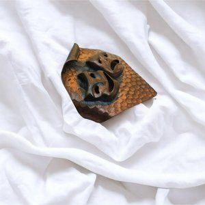 Older southwestern copper brooch features a curved upper lip and two masks, one happy, one sad and measuring about 2" tall. This brooch has some surface wear. We have not cleaned this piece of jewelry to keep it's vintage look intact, copper can easily be cleaned with vinegar or other common cleaners of the new owner desires.