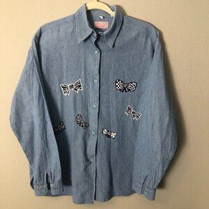 VTG Comme Adrienne Paris Denim Shirt XL Blue Embroidered Bows Coastal Grandma