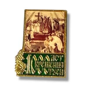 The pin is a commemorative badge celebrating the 1000th anniversary of the Christianization of Rus' in 1988. The event marks the baptism of Prince Vladimir I of Kyiv and his subjects into Christianity in 988, a turning point