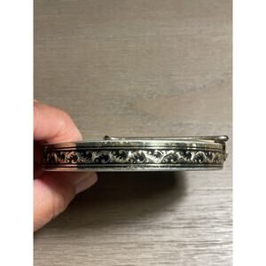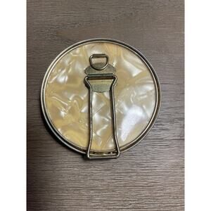 The product is a vintage compact mirror made of celluloid, with a metal and plastic construction. It is foldable and was manufactured in Japan. The small size and handmade design make it a unique and collectible item for those interested in Japanese craftsmanship and vintage accessories.
