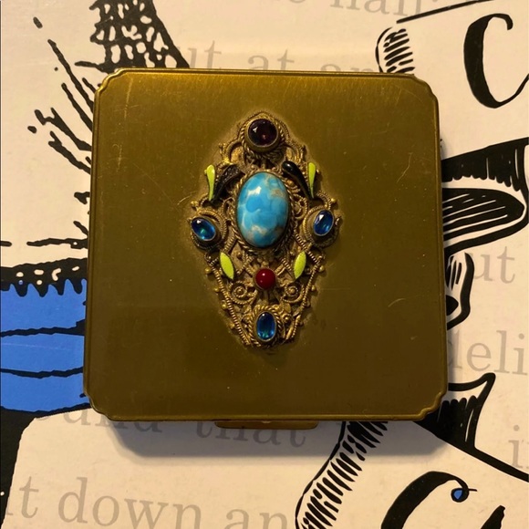If you are a vintage make up lover like me than you love nothing more than the smell of old compact powder. This compact is vintage and it still has some powder left in the compact. The front is adorned with gemstones of multicolors. This compact is in overall good condition.