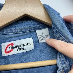 Get ready to rev up your wardrobe with this awesome vintage Jeff Gordon Competitors View denim button-down shirt. This long-sleeve, collared shirt features cool embroidered details and a classic blue color. Perfect for any NASCAR fan or anyone looking to add a touch of retro style to their look. It's a men's size large.