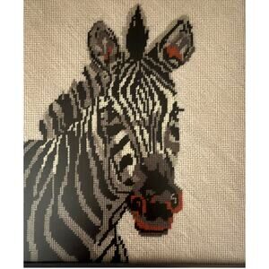 Vintage Completed Needlepoint Zebra Cross-stitch Framed Glass Picture 12.5x14.5